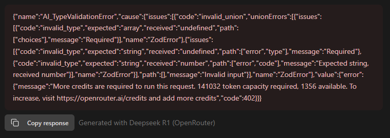 {"name":"AI_TypeValidationError","cause":{"issues":[{"code":"invalid_union","unionErrors":[{"issues":[{"code":"invalid_type","expected":"array","received":"undefined","path":["choices"],"message":"Required"}],"name":"ZodError"},{"issues":[{"code":"invalid_type","expected":"string","received":"undefined","path":["error","type"],"message":"Required"},{"code":"invalid_type","expected":"string","received":"number","path":["error","code"],"message":"Expected string, received number"}],"name":"ZodError"}],"path":[],"message":"Invalid input"}],"name":"ZodError"},"value":{"error":{"message":"More credits are required to run this request. 141032 token capacity required, 1356 available. To increase, visit https://openrouter.ai/credits and add more credits","code":402}}}